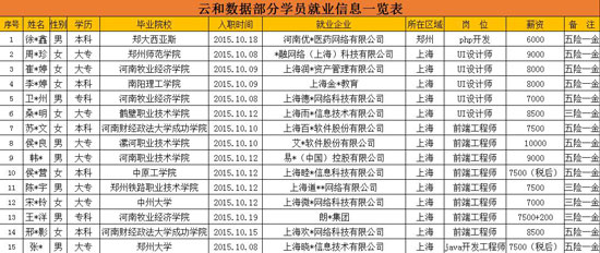 这张照片拍摄于2015年11月1日。照片中拿着学生就业合同的老师是刚在上海辗转数月返回公司的云和学院马老师,桌子上放的是云和学员毕业学生最新就业表,表格中,学生们的平均薪资接近8500元,最高的月薪达万元!这张纸很轻,轻的是重量,这张纸又很重,因为它承载着就业部老师们一个月来日日夜夜的汗水与辛劳,这一刻,她们的内心是满足的,充实的,有成就感的,同时也是欣慰的,欣慰学生在自己的教导下可以有更好的平台,欣慰学生可以受到知名企业的青睐。